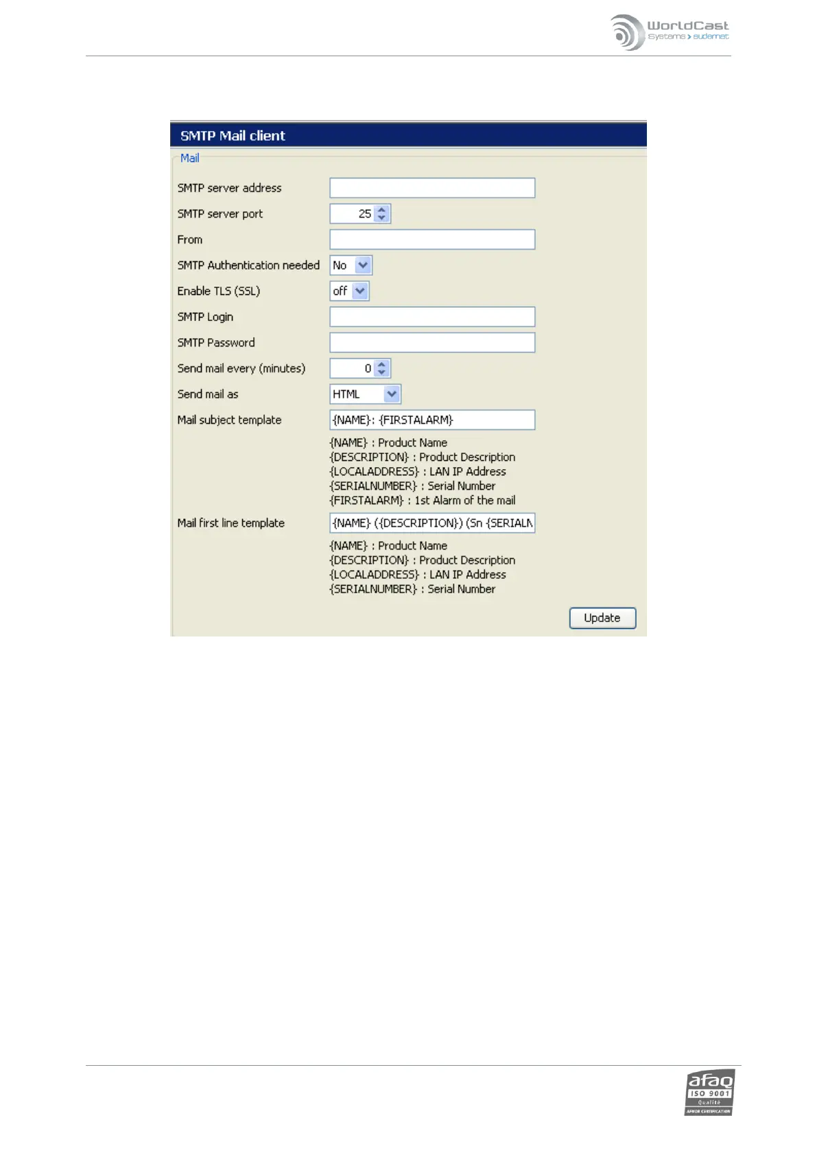 Enter the SMTP server address server port, account information to enable sending of e-mail alerts. Ask