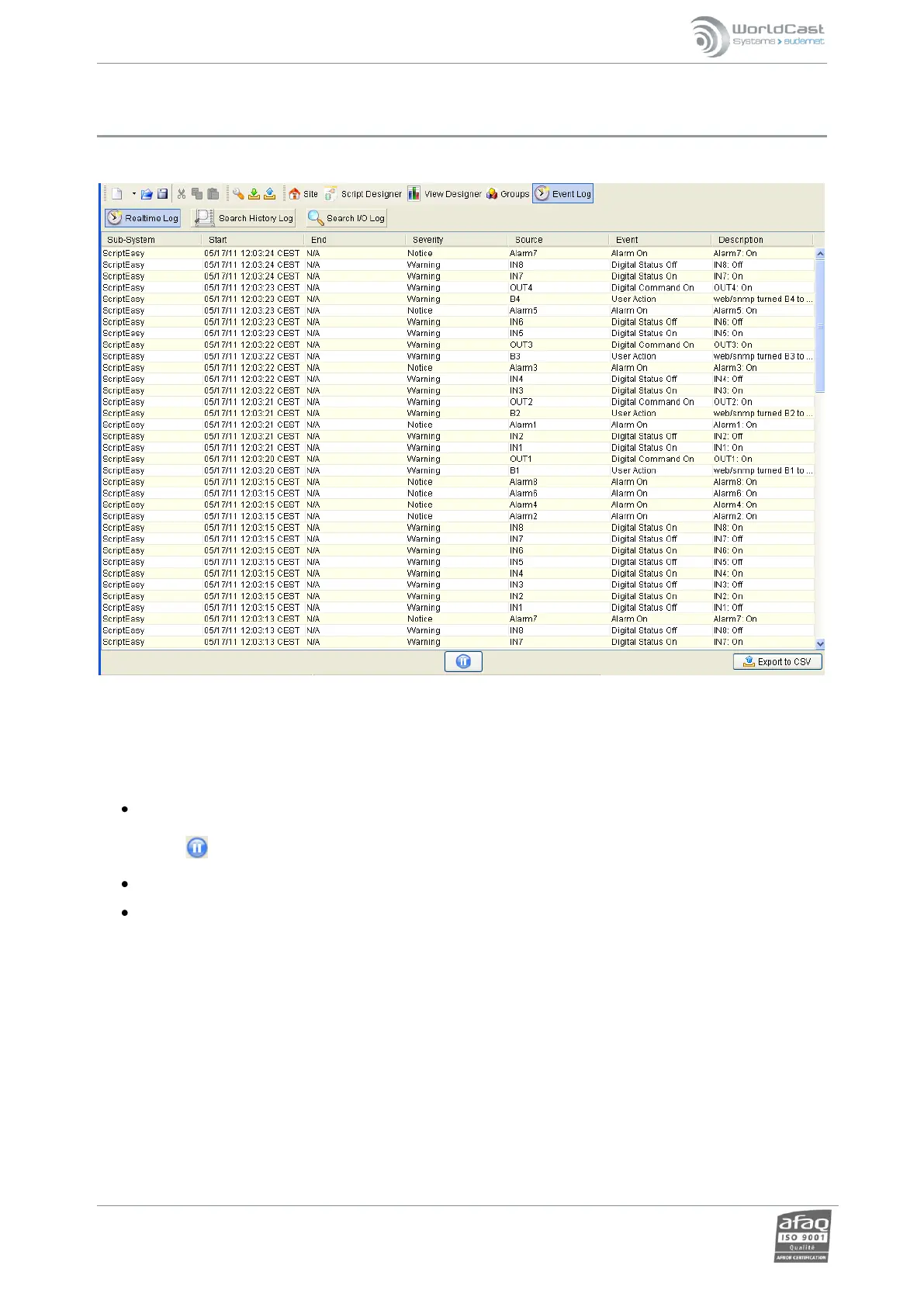 severity, event type and description. The list is refreshed automatically; it is however possible to pause