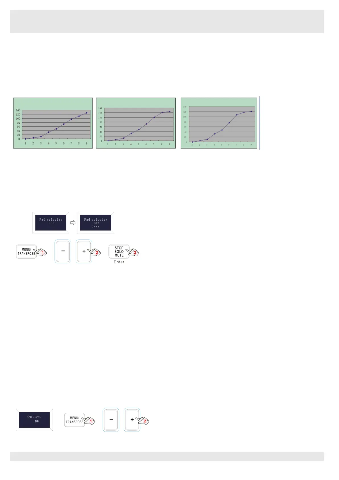 function is valid, the OLED displays the “Pad velocity” and the Number of current pad velocity curve. It can be adjusted by +/- button and