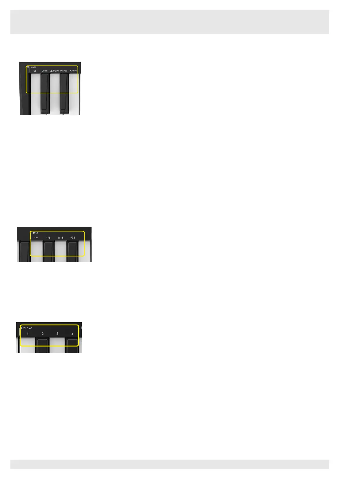 key below 1, 2, 3 or 4. Choosing an octave higher than 1 will repeat the arpeggio at higher octaves. For example, an arpeggio that was