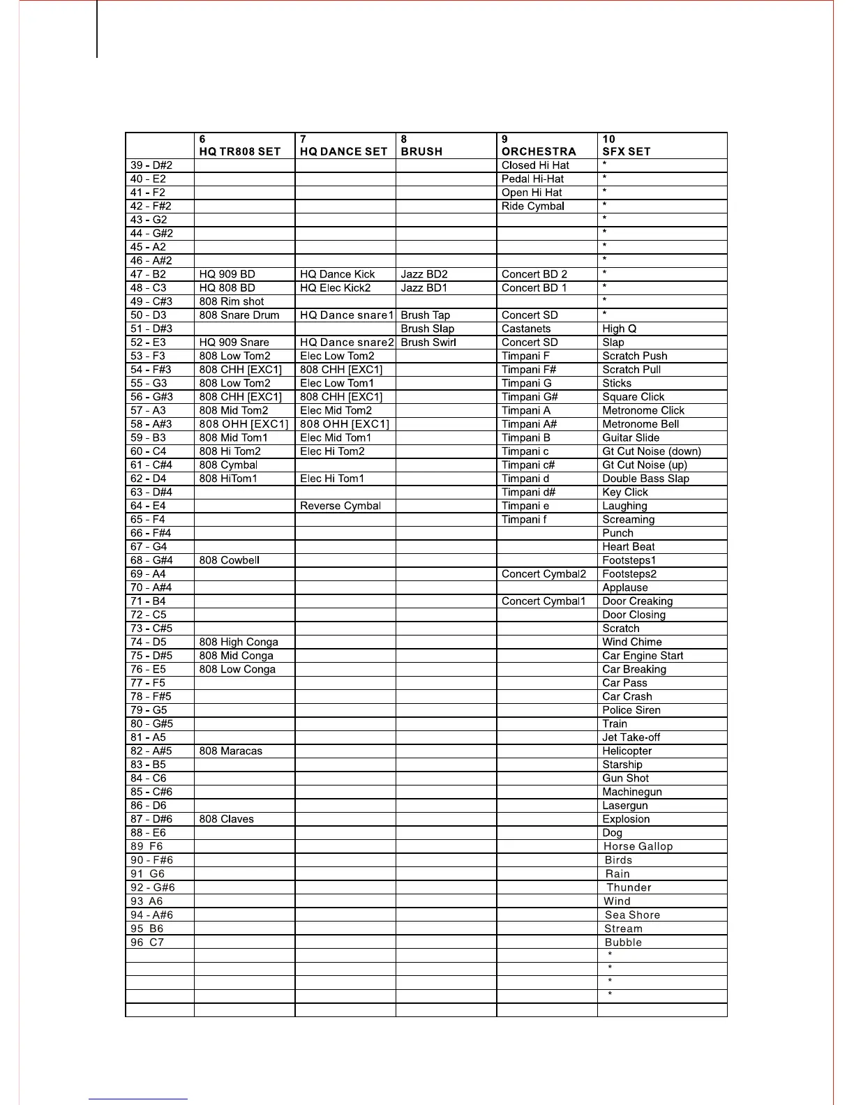 DRUM SET TABLE (MIDI CHANNEL 10)
