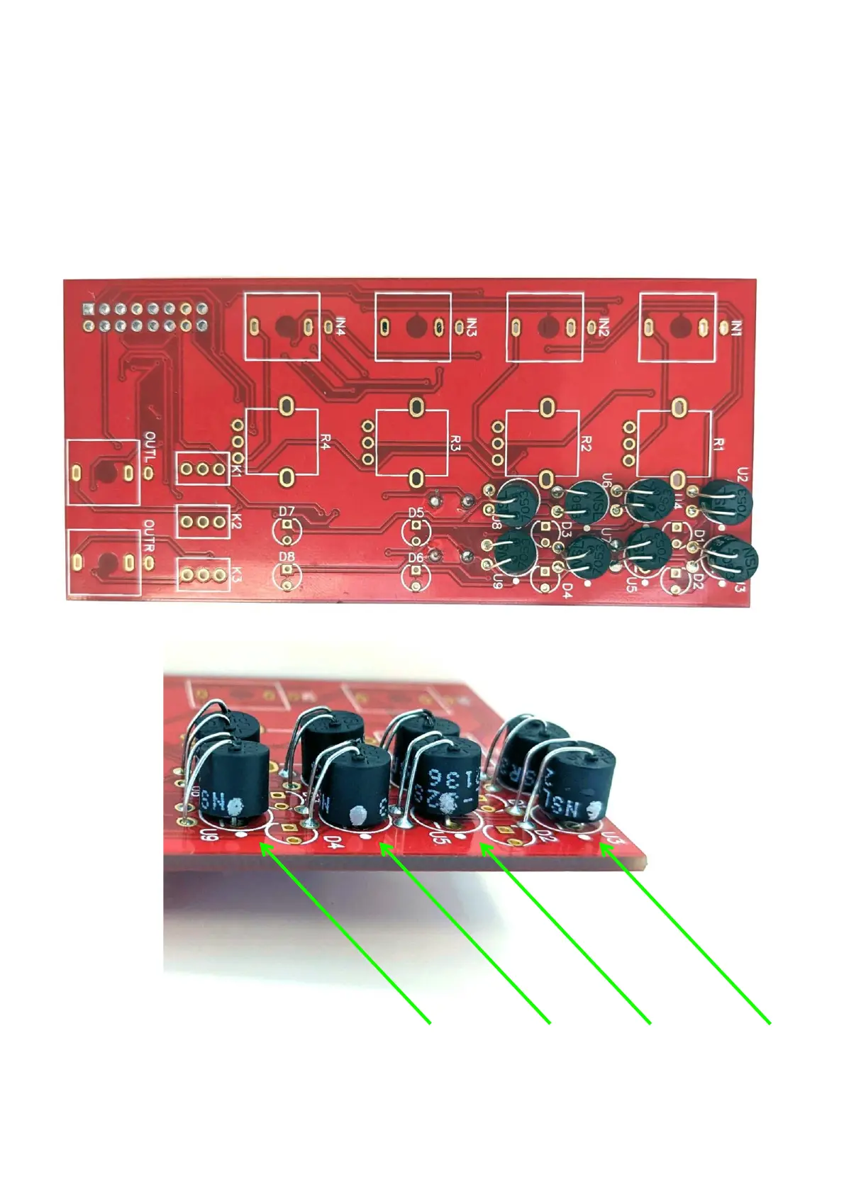 1. First place the 8 vactrols on the PCB as shown. NOTE: orientation is vital! The dot on