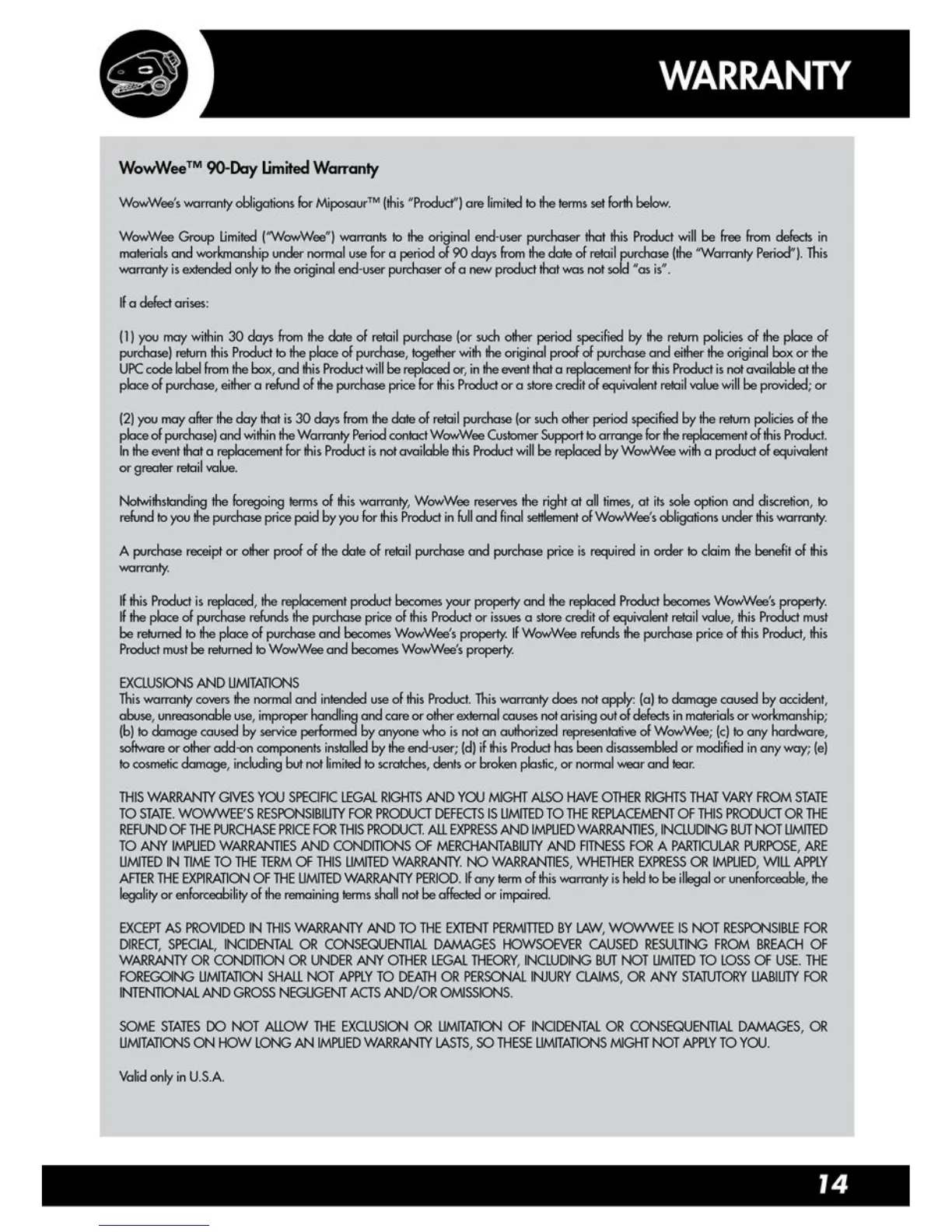 WowWee MiPosaur - Miposaur Warranty Information; 90-Day Limited Warranty Terms; Warranty Exclusions and Limitations