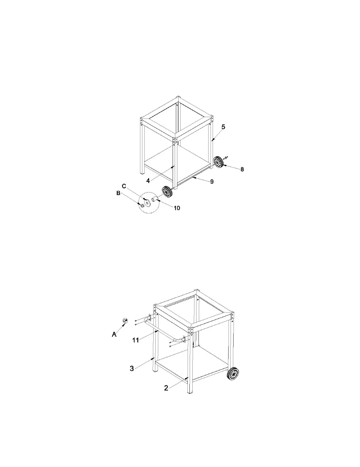 Slide the Axle (9) through the wheel legs (4 and 5), slide a Wheel (8) and Sleeve (10) and Flat washer