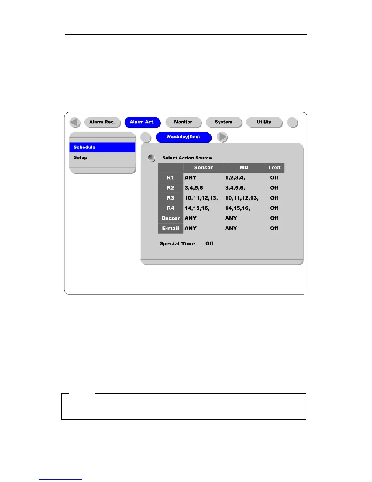 In the menus of Relay1~Relay4, Buzzer, and E-mail, Sensor or MD can be set upto 4EA or ANY. And
