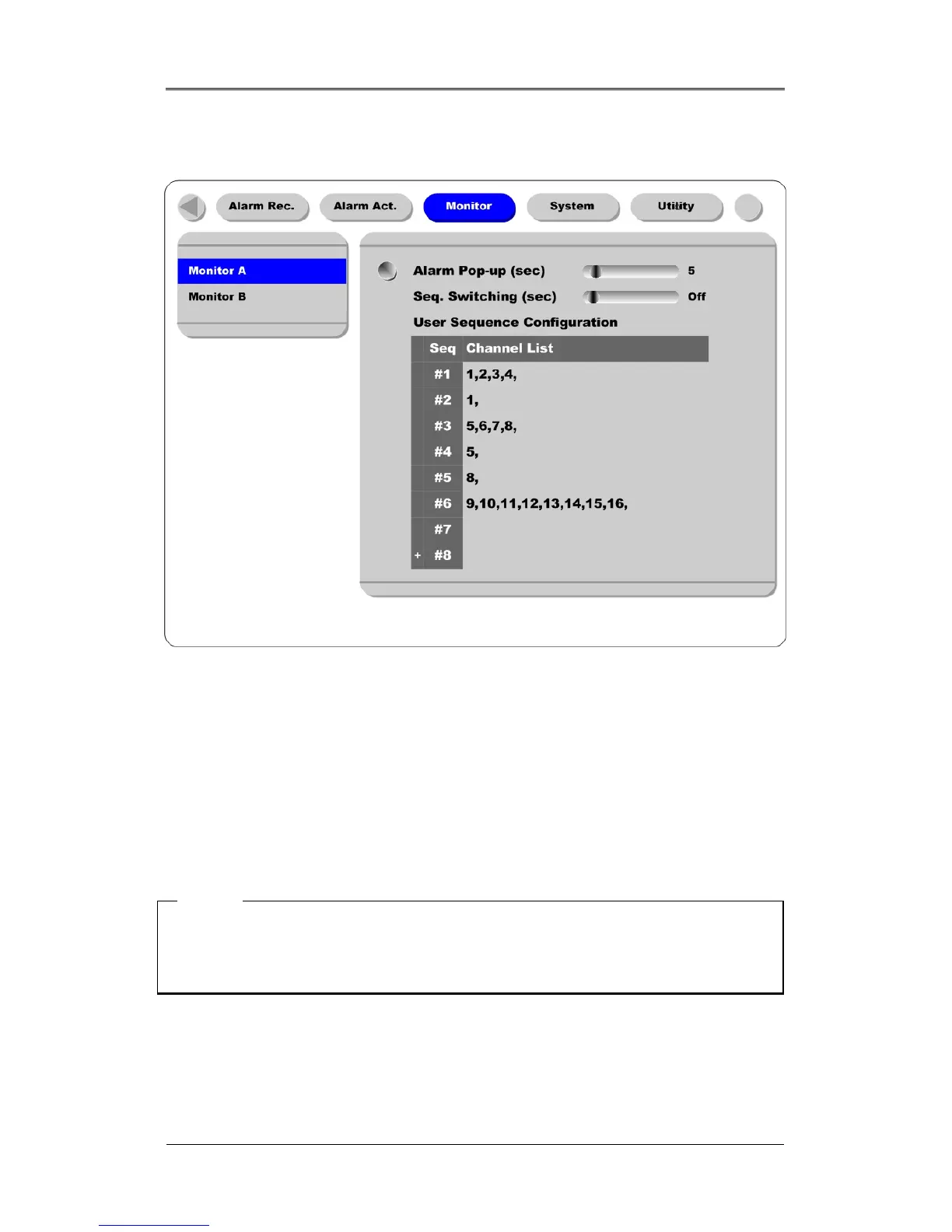 This function is used to set the alarm pop-up screen. . The pop-up duration time can be set between 5 and