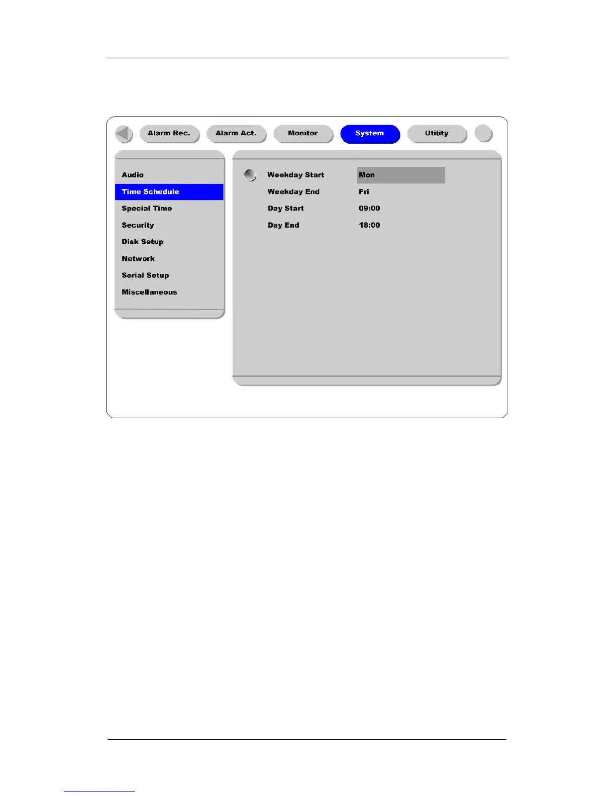 Press the [ENTER] button to access the Time Setting. Set the range for “Weekday” between Monday