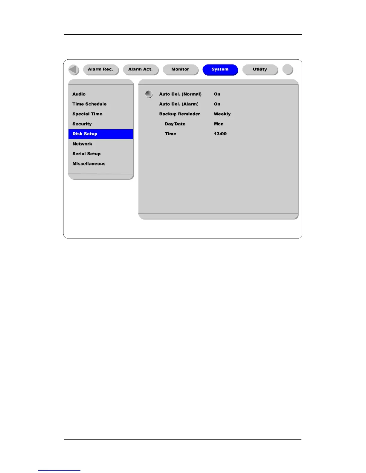 A Backup Reminder can be set to remind users to backup the HDD. The reminder can be set to appear