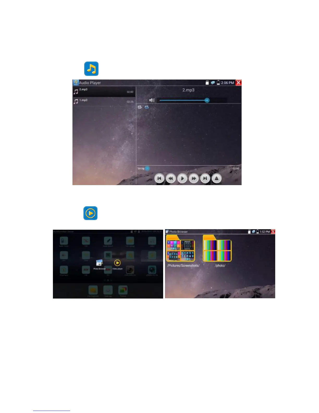 The Media player can browse video and image files. It supports the video formats of MP4, H.264,