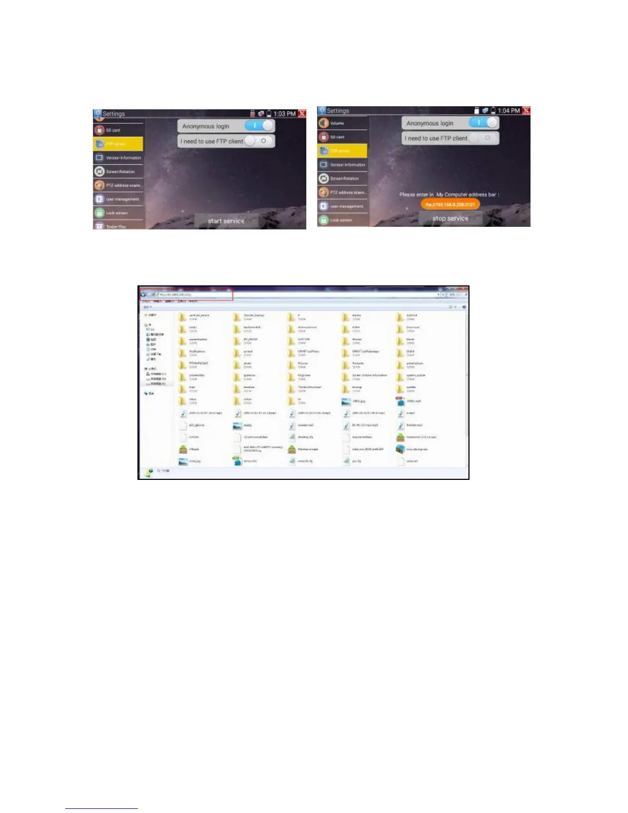 Start the FTP server and then input the tester’s FTP address in the PC’s address bar. This will enable the