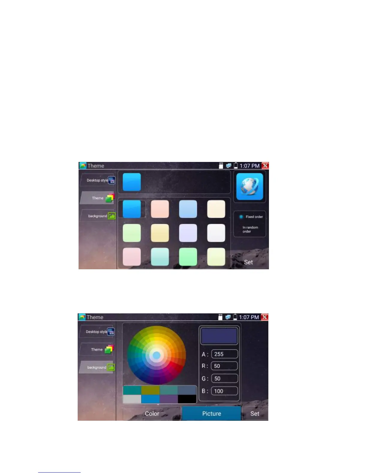 When set background color, you can select colors from Color Phase, and also can input color’s RGB to
