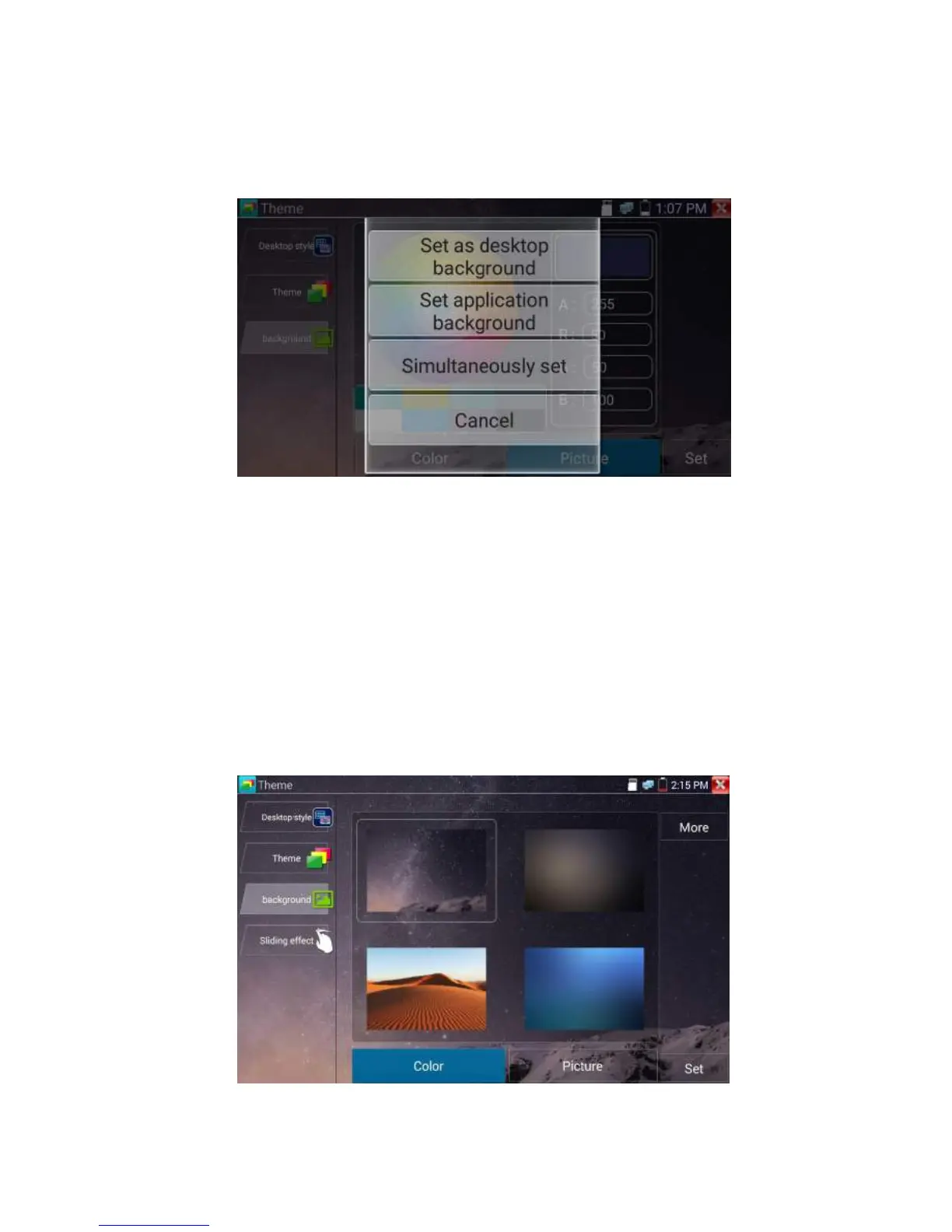 Click Picture to select one, and set as temporarily background to view setting effect. Click “more” to