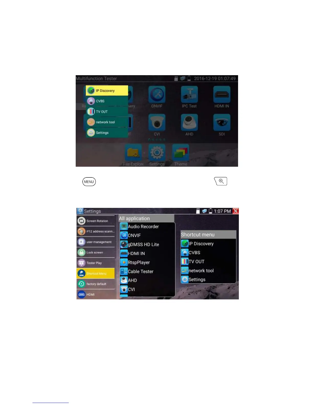 You can call shortcut –menu by press tester’s “menu” key, you can self- define shortcut -menu
