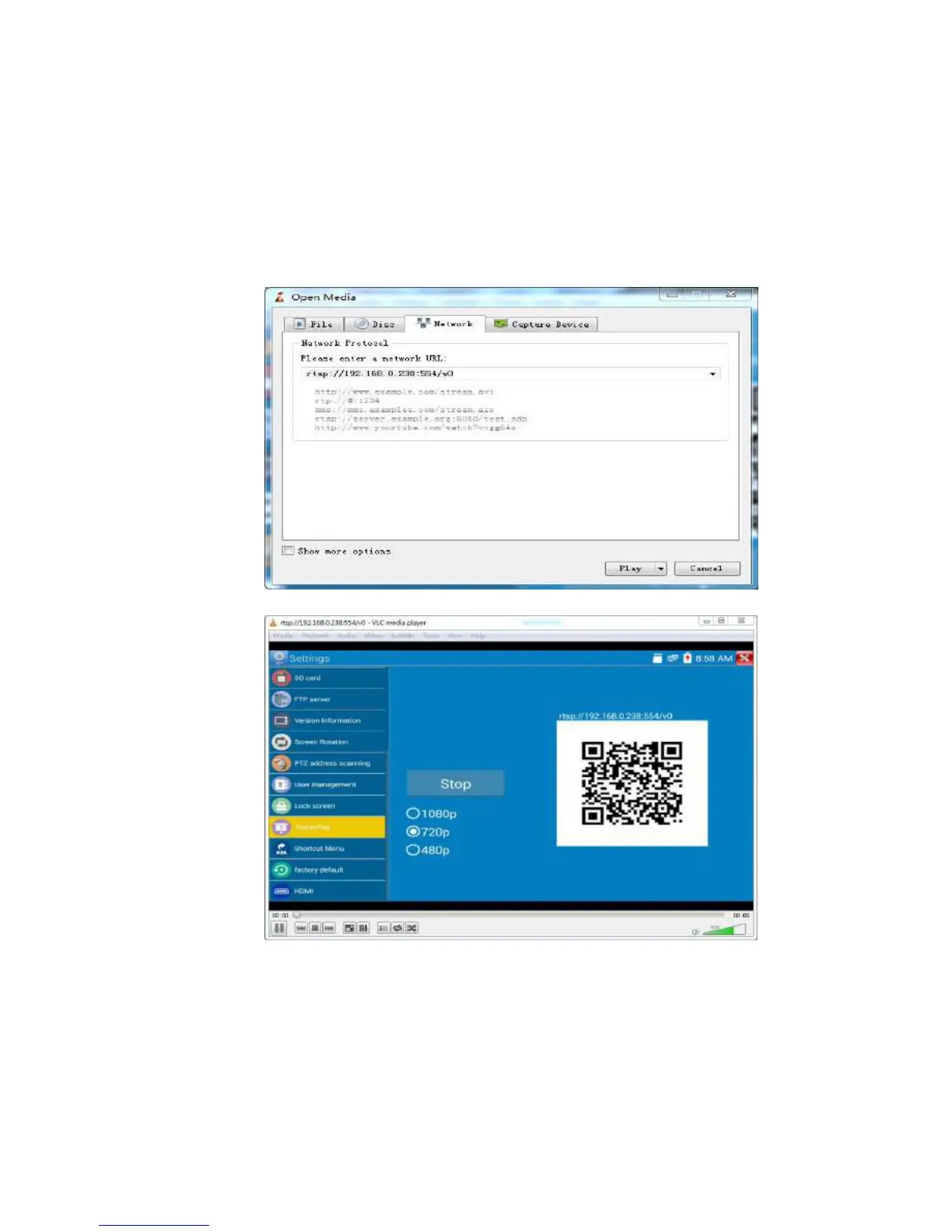 input the RTSP address of on the top instrument two-dimensional code, click "play" to view the