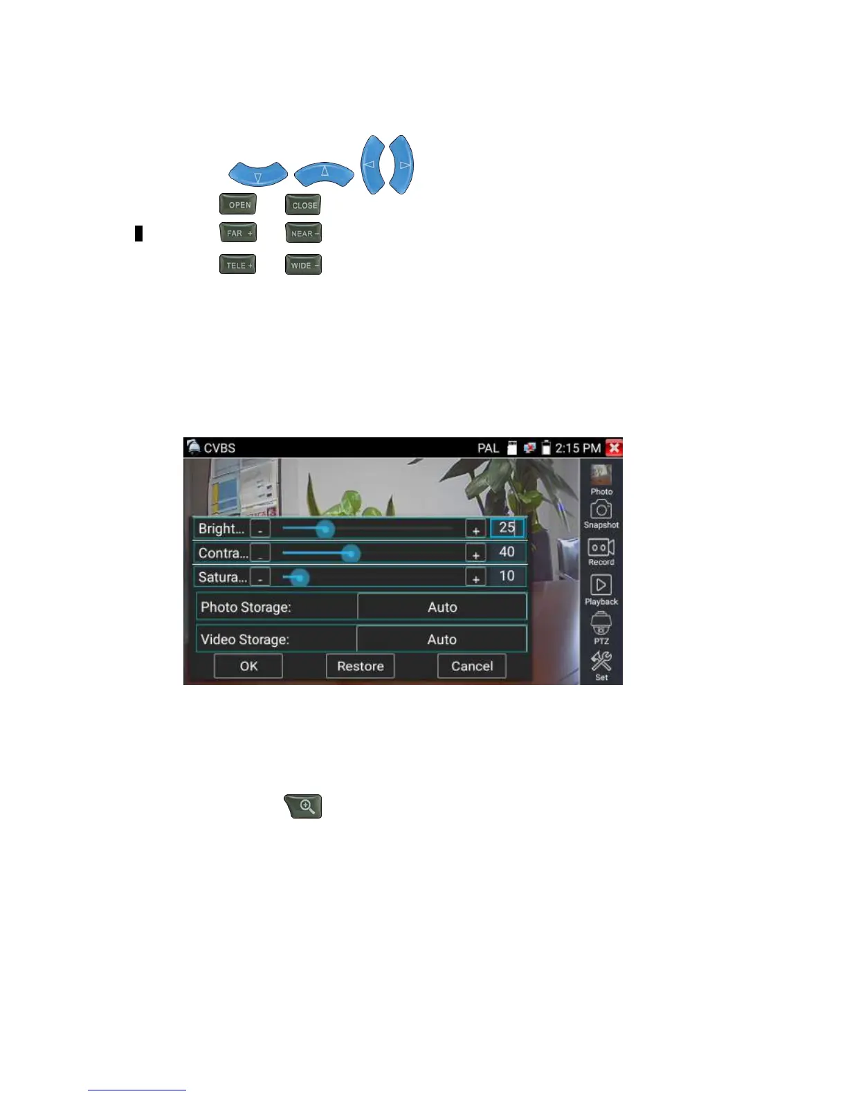Click icon “set”,to enter and set analog video image brightness , contrast, color saturation, as well as the