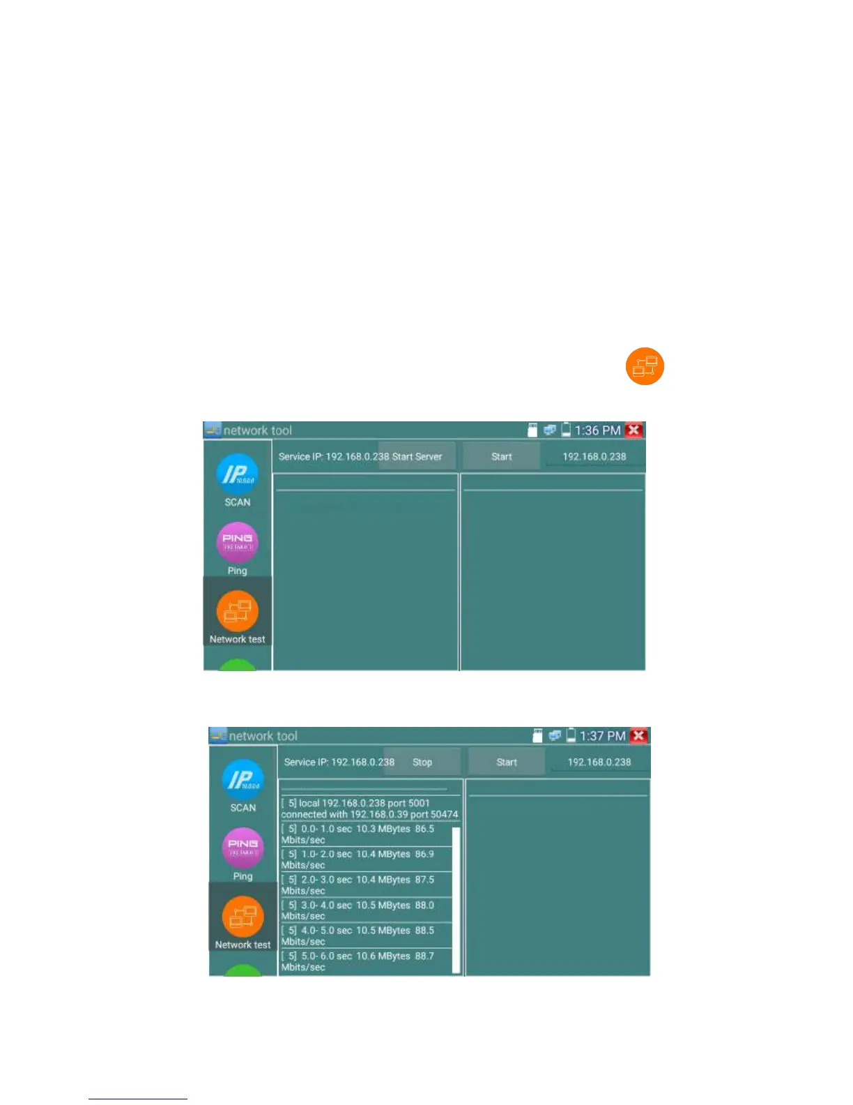 To use the Network tester, you will need two IP testers. One is used as a Server and the other as a Client.