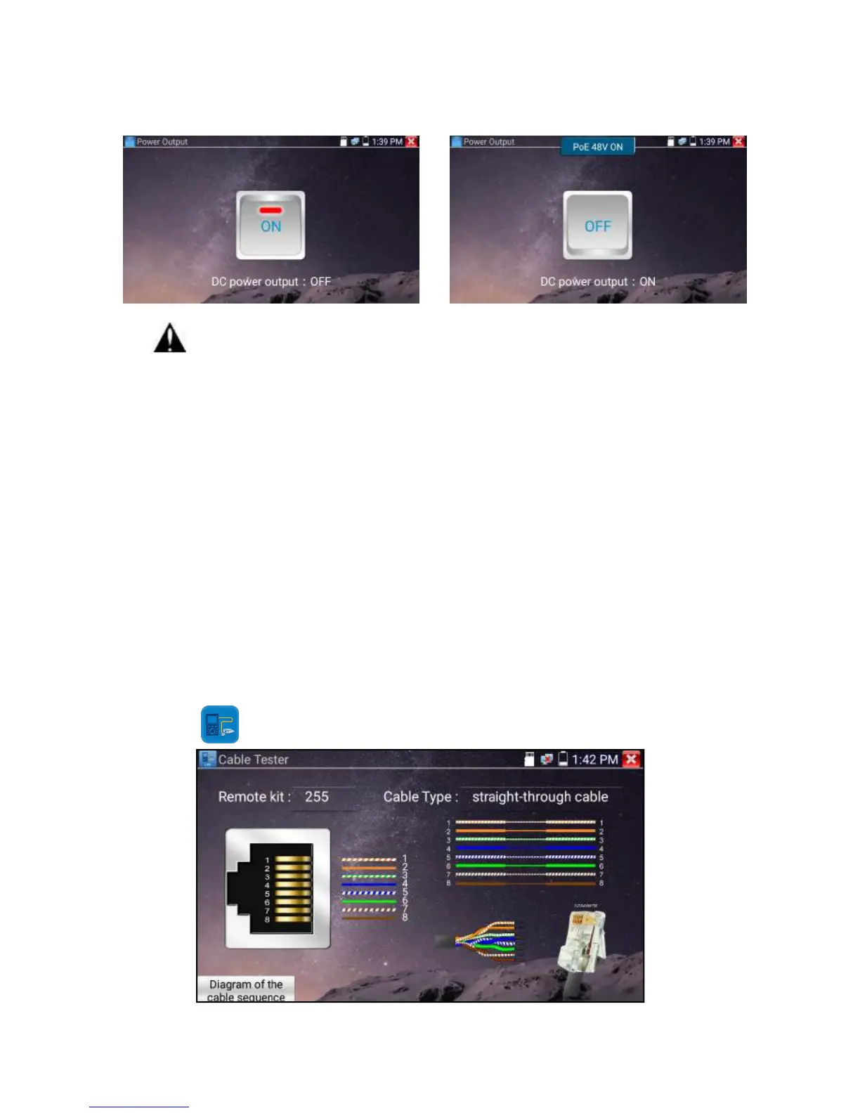 2. Don’t output this DC12V/2A power to the DC12V/IN port of the IP camera tester to avoid destroy