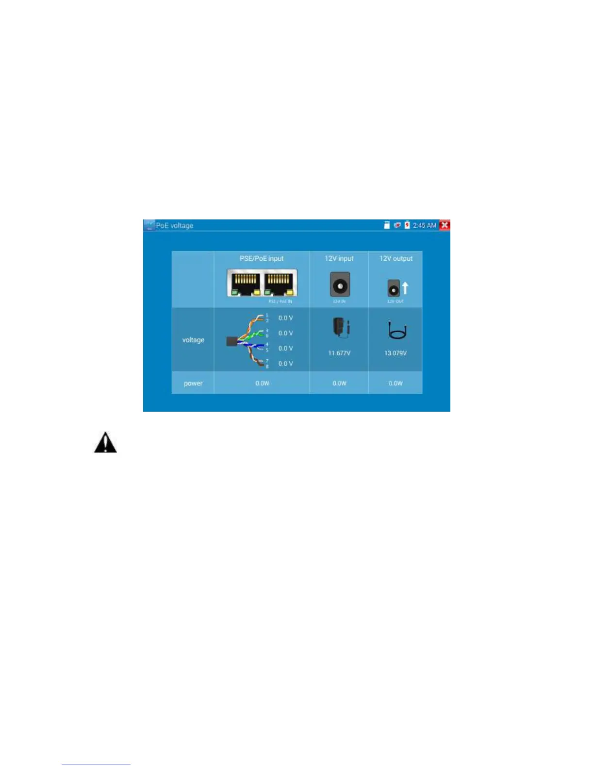 Connect 12V power adaptor to tester’s charging port, then click icon “PoE” to enter voltage