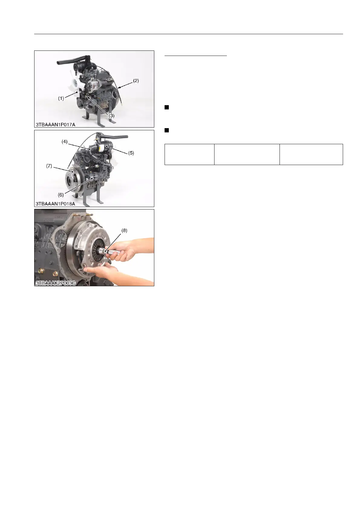 1. Remove the cooling fan (1), fan belt (3), fan pulley, hour meter