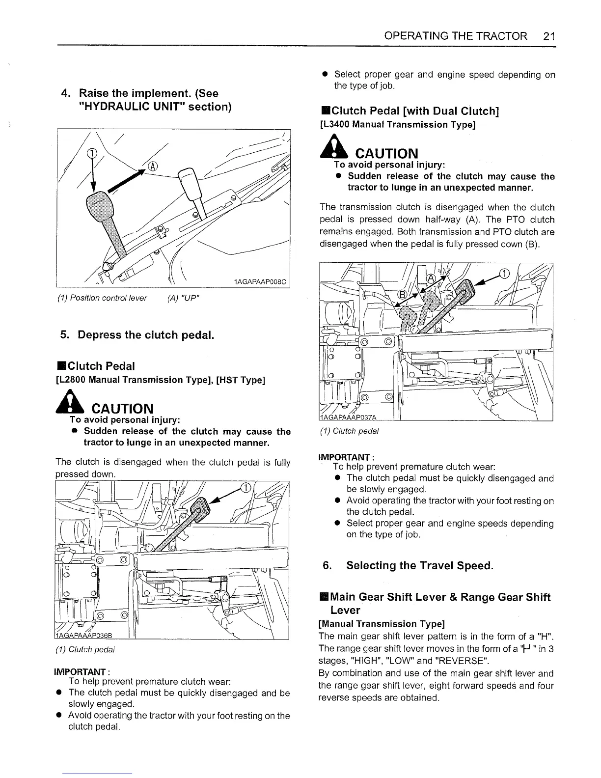 wsm L2800 - Raise the Implement; Depress the Clutch Pedal; Selecting the Travel Speed; Main Gear Shift Lever & Range Gear Shift Lever [Manual Transmission Type]