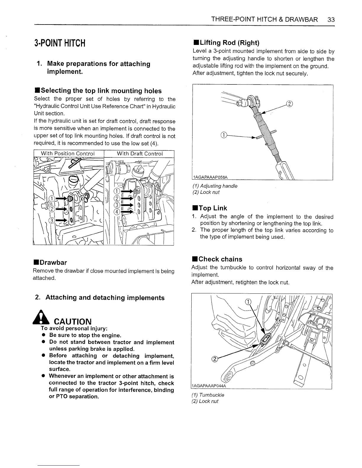 wsm L2800 - 3-Point Hitch; Make Preparations for Attaching Implement; Selecting the Top Link Mounting Holes; Attaching and Detaching Implements