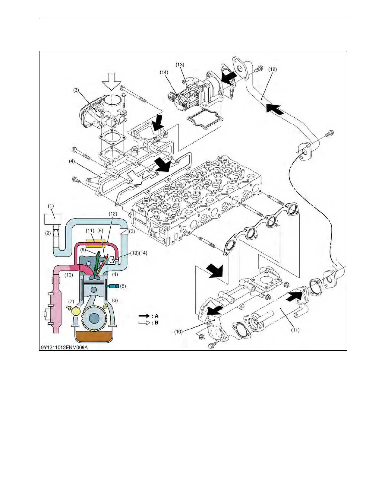 The EGR being used on this engine is electronic and is made up of an EGR cooler (11), EGR lift sensor (14),