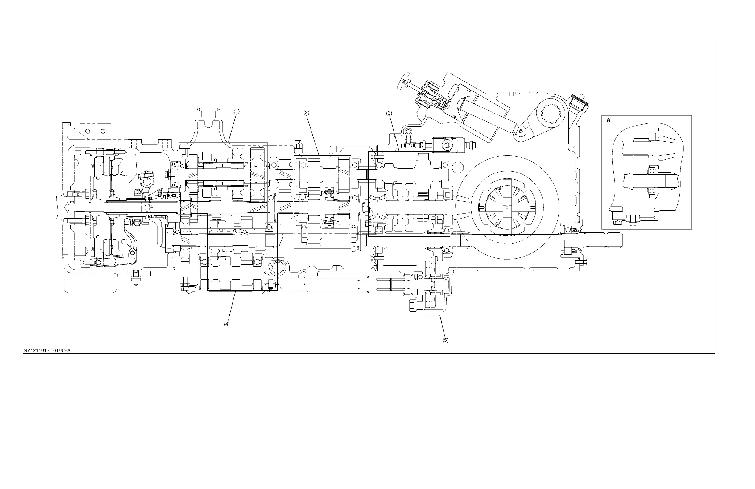 (1) Main Gear Shift Section (2) Synchro-shuttle Gear Shift Section (3) Range Gear Shift Section (4) PTO Gear Shift Section (5) Front Wheel Drive Section (4WD Model Only) A: 2WD Model