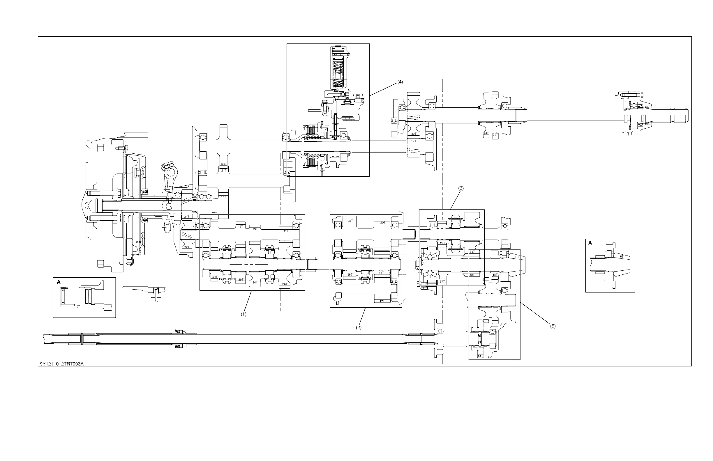 (1) Main Gear Shift Section (2) Synchro-shuttle Gear Shift Section (3) Lo Range Gear Shift Section (4) PTO Clutch Section (5) Front Wheel Drive Section (4WD Model Only) A: 2WD Model