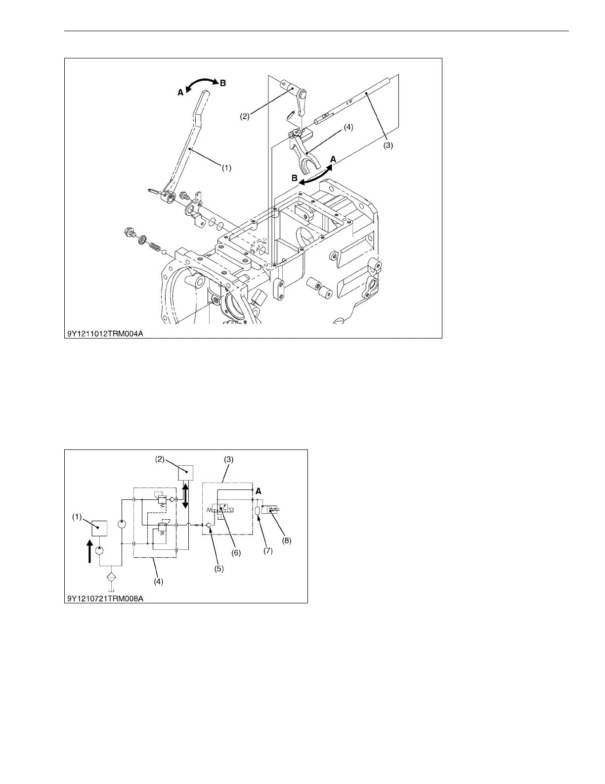When the PTO shift lever (1) is moved to the "A" side or the "B" side, the PTO shift fork (4) is moved by means