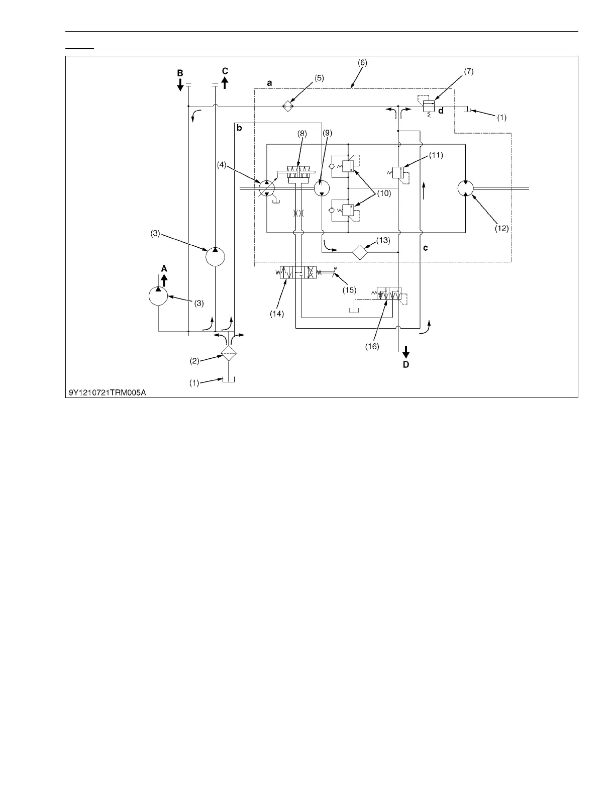 Oil flows in HST case from b-port and is sent to c-port with the charge pump (9). Oil from c-port is sent to HST