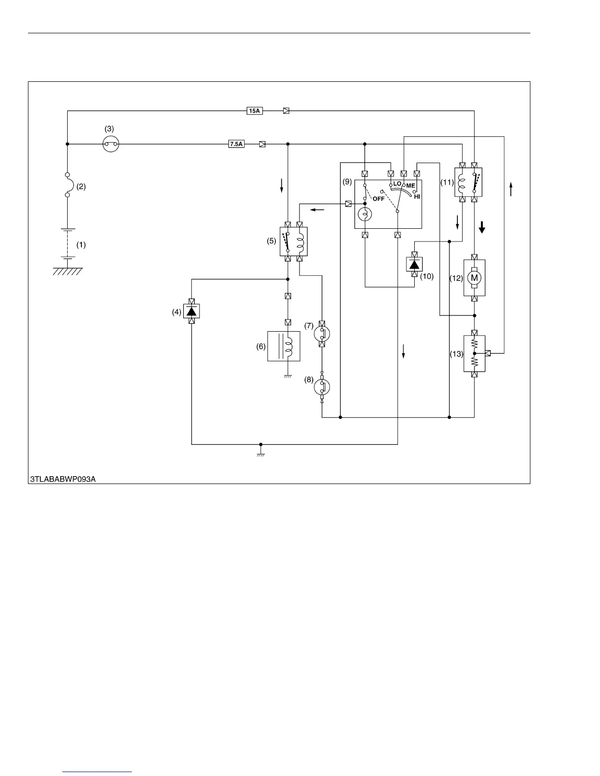 Battery (1) → Slow Blow Fuse (2) → Main Switch (3) → Fuse (7.5 A) → A/C Blower Relay Contact (12) → Blower