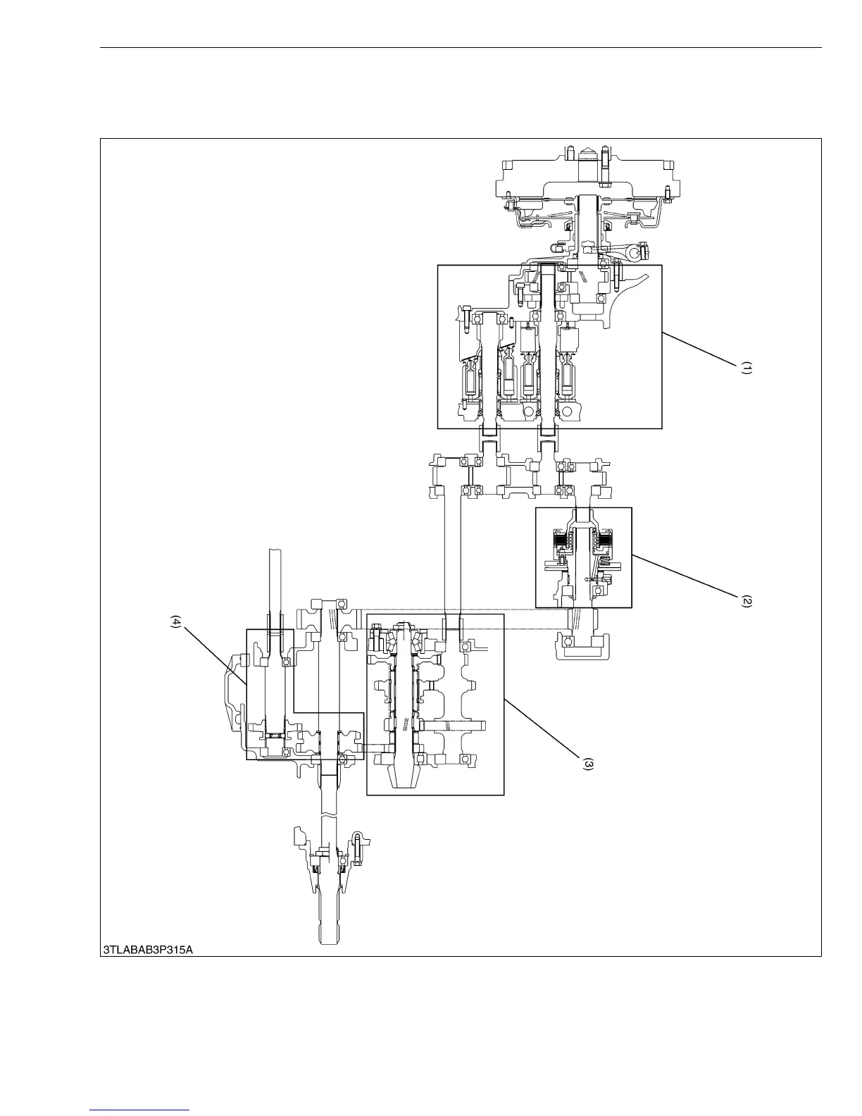 (2) PTO Clutch Section (3) Range Gear Shift Section (4) Front Wheel Drive Shift