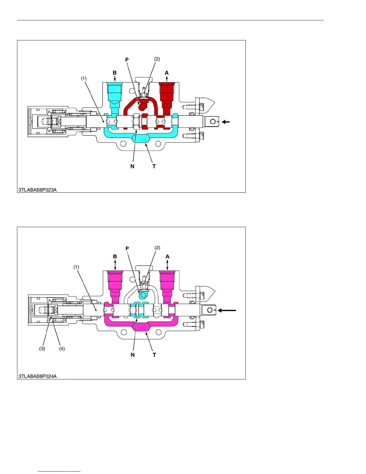 And, the A port and B port lead to the T port along the notched sections of the spool (1). This result in the attached