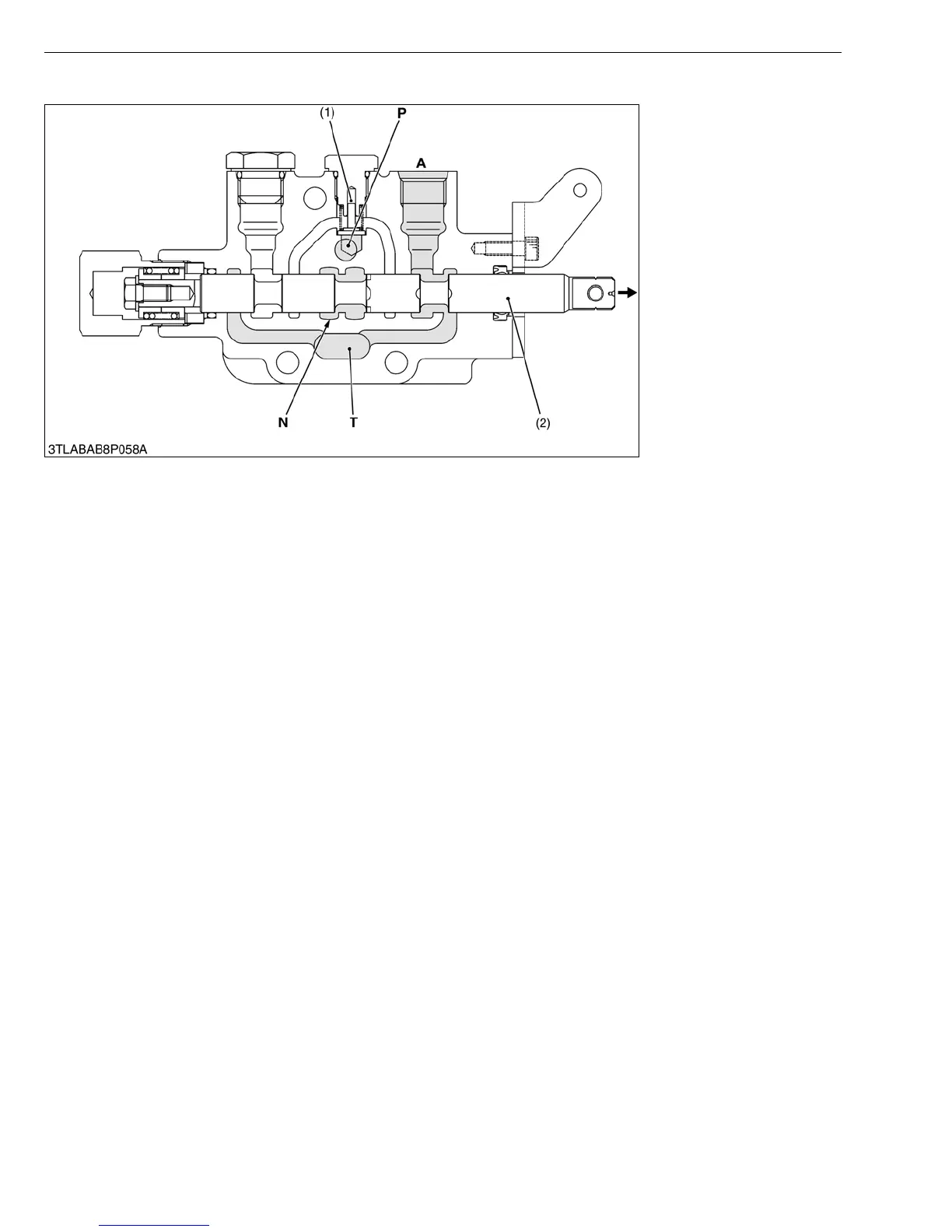 When the spool (2) is moved in the direction of the arrow, return oil from the implement cylinder flows from the A