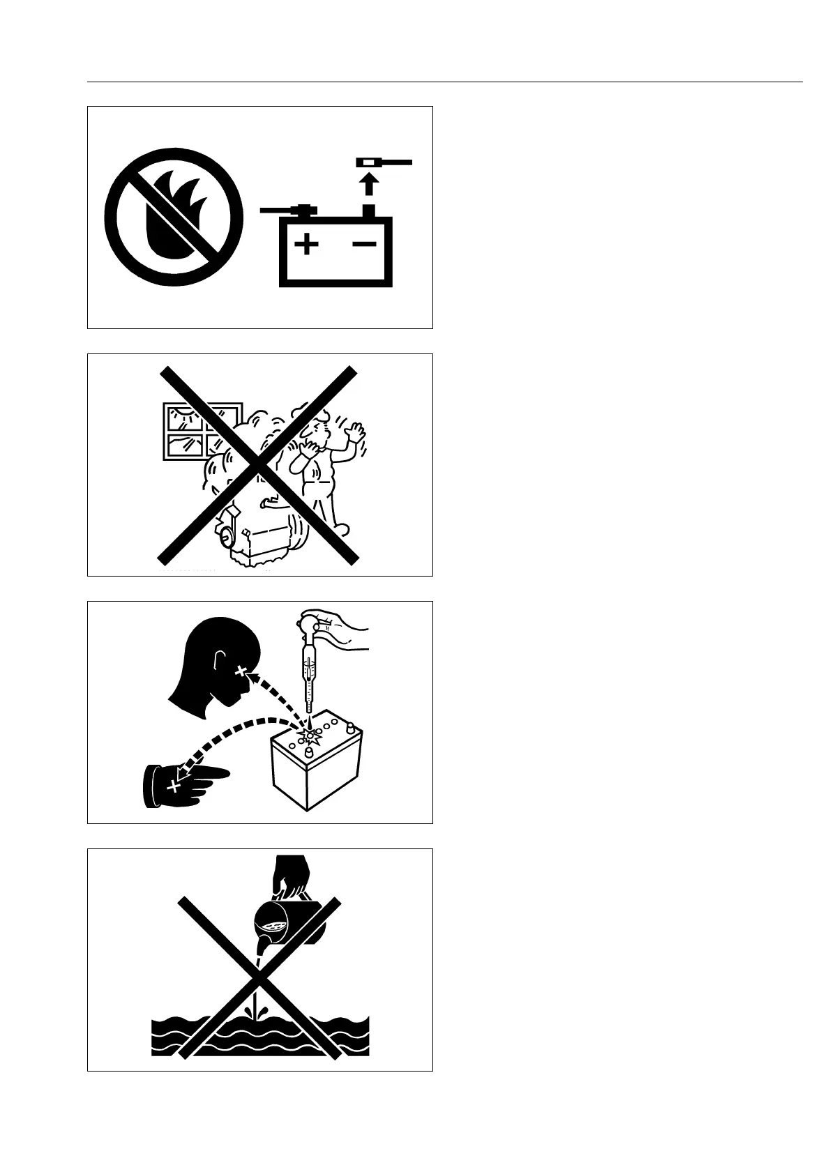 • Battery gas can explode. Keep sparks and open