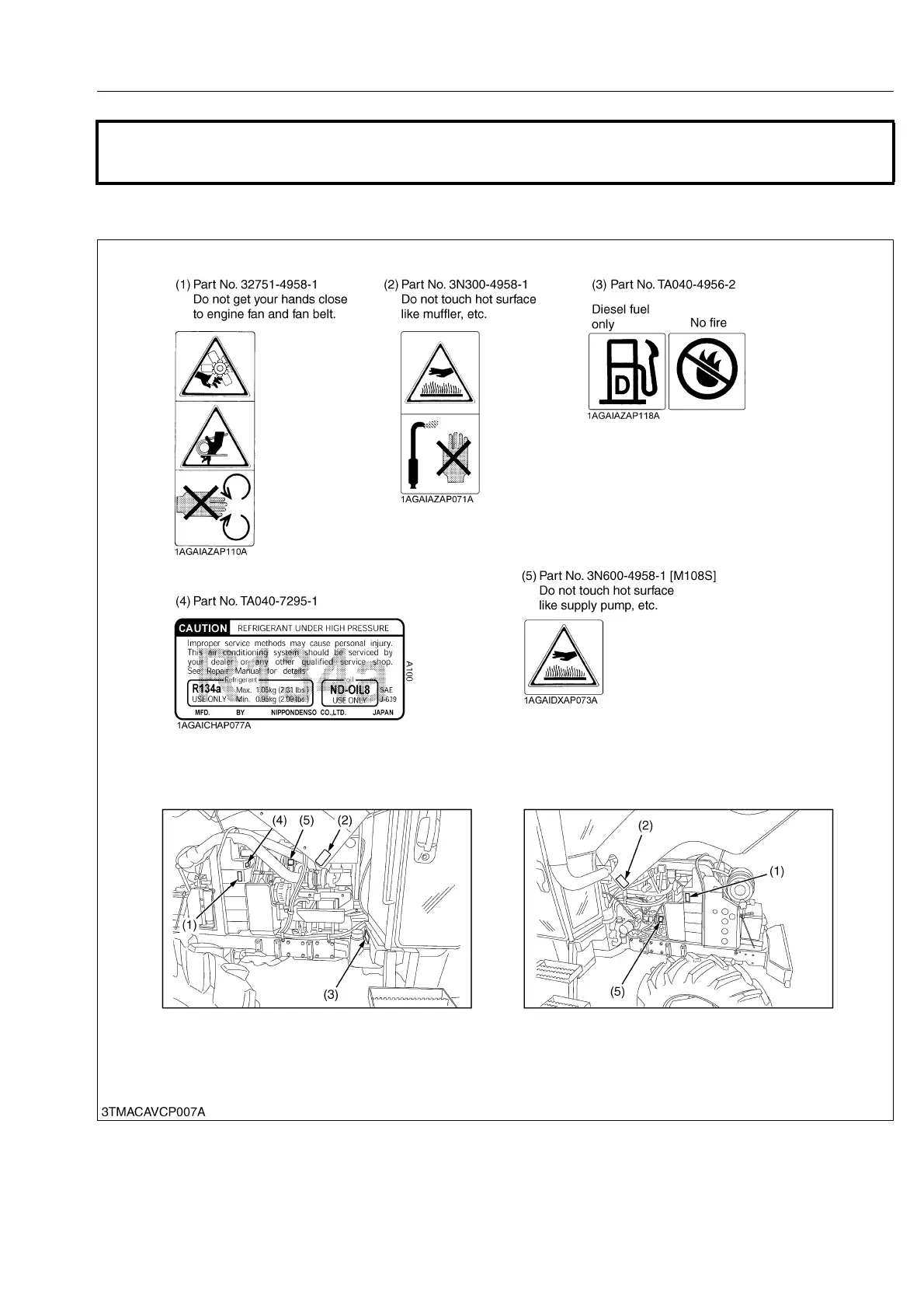 The following safety decals are installed on the machine. If a decal becomes damaged, illegible or is not on