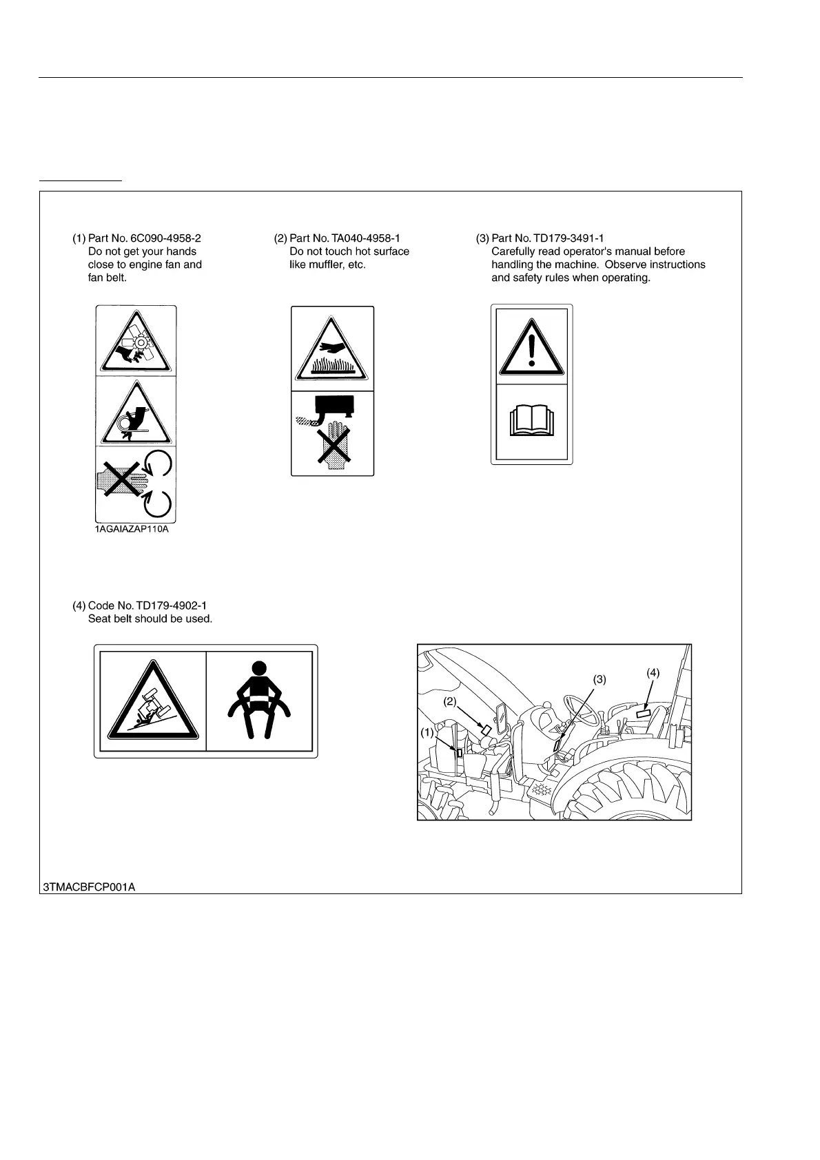 The following safety decals (pictorial safety labels) are installed on the machine. If a decal becomes