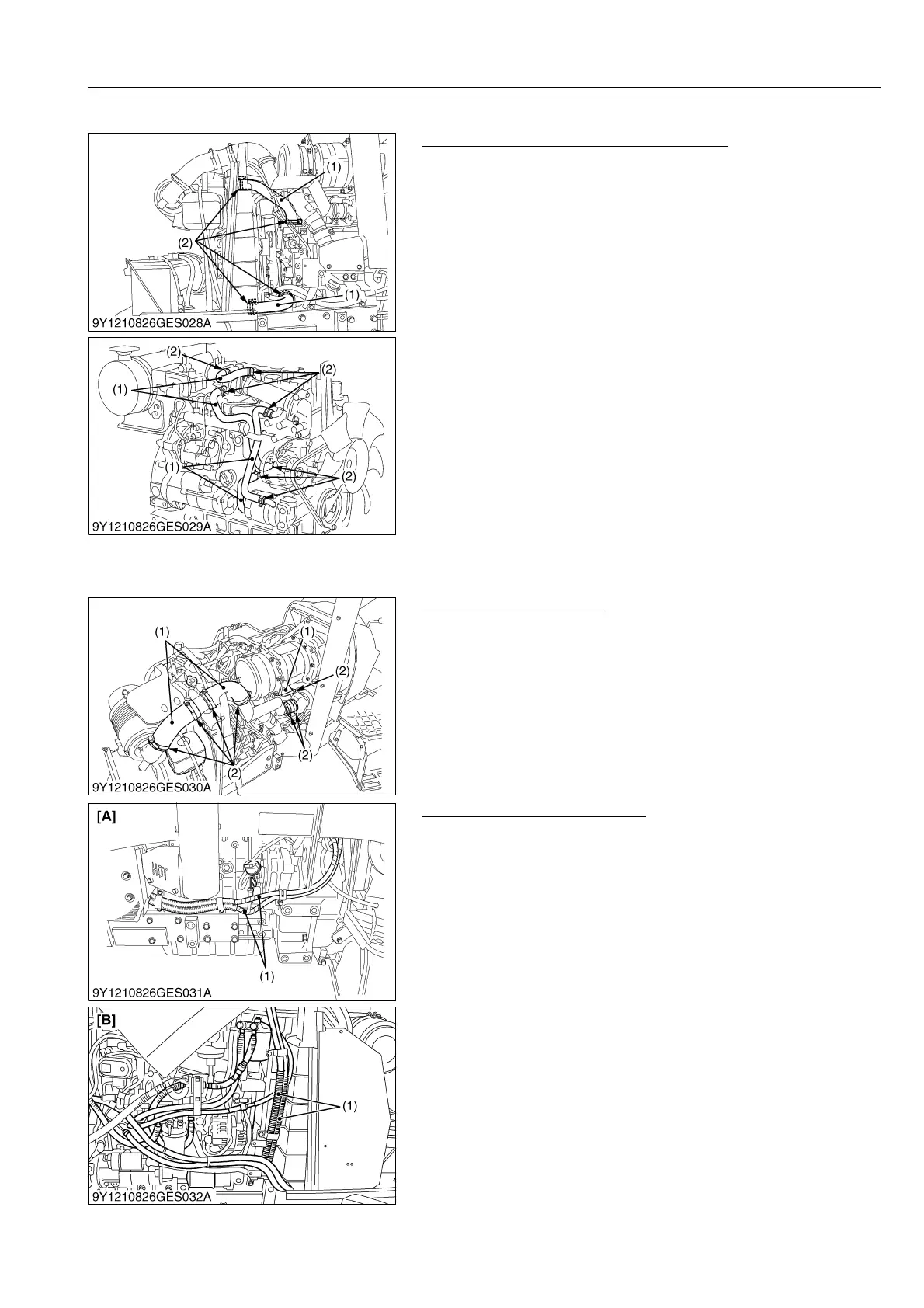 2. Replace hoses (1) and tighten hose clamps (2) securely, if