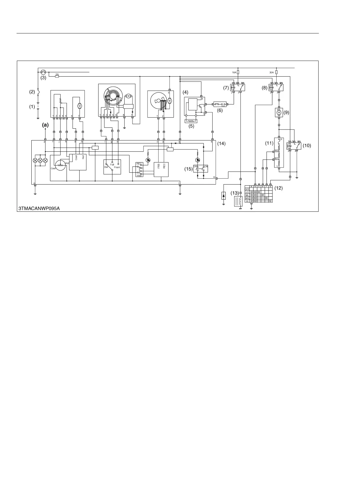 Main Switch (3) ON → A/C Switch (15) ON → Blower Switch (12) ON (Low, Medium 1, Medium 2 or High) →