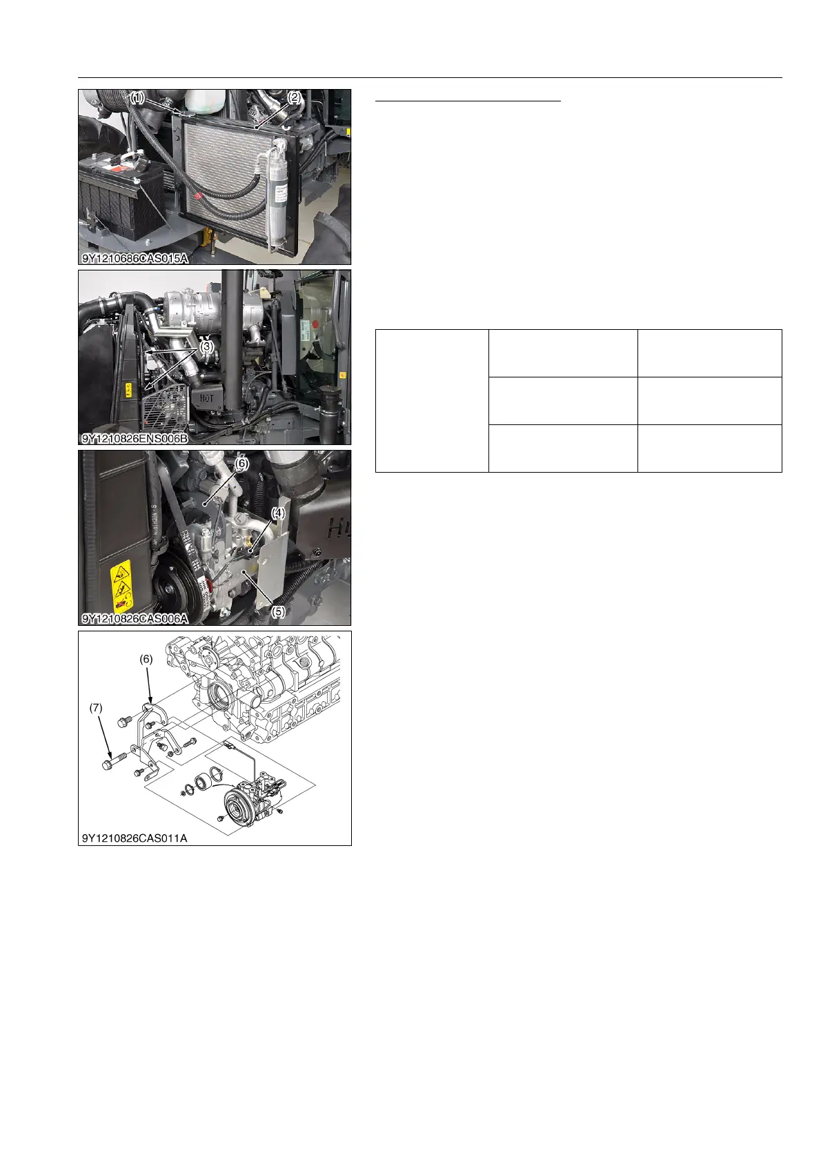 4. Remove the compressor stay (6) mounting screw 2 (7) from