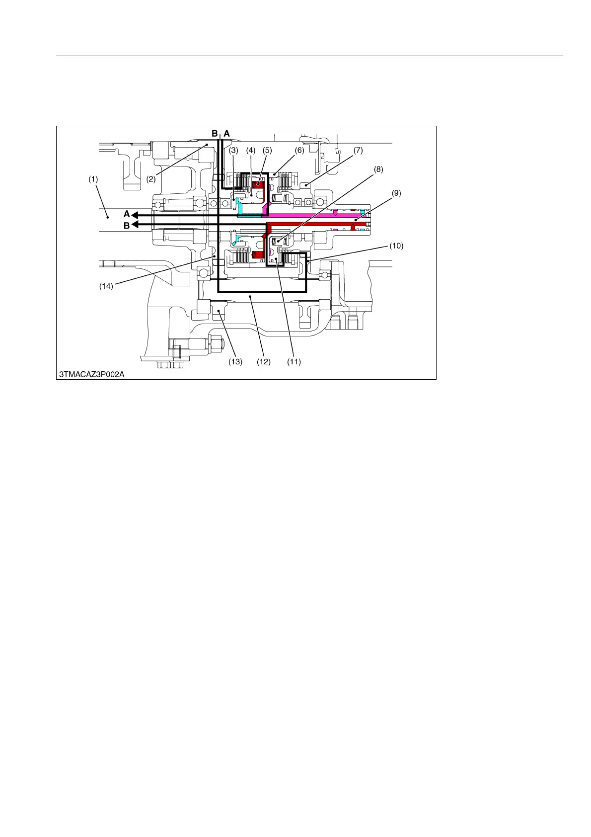 • The hydraulic system pressure is fed to between the neutral cover (3) and 4WD piston (4) at 4WD switch is turned