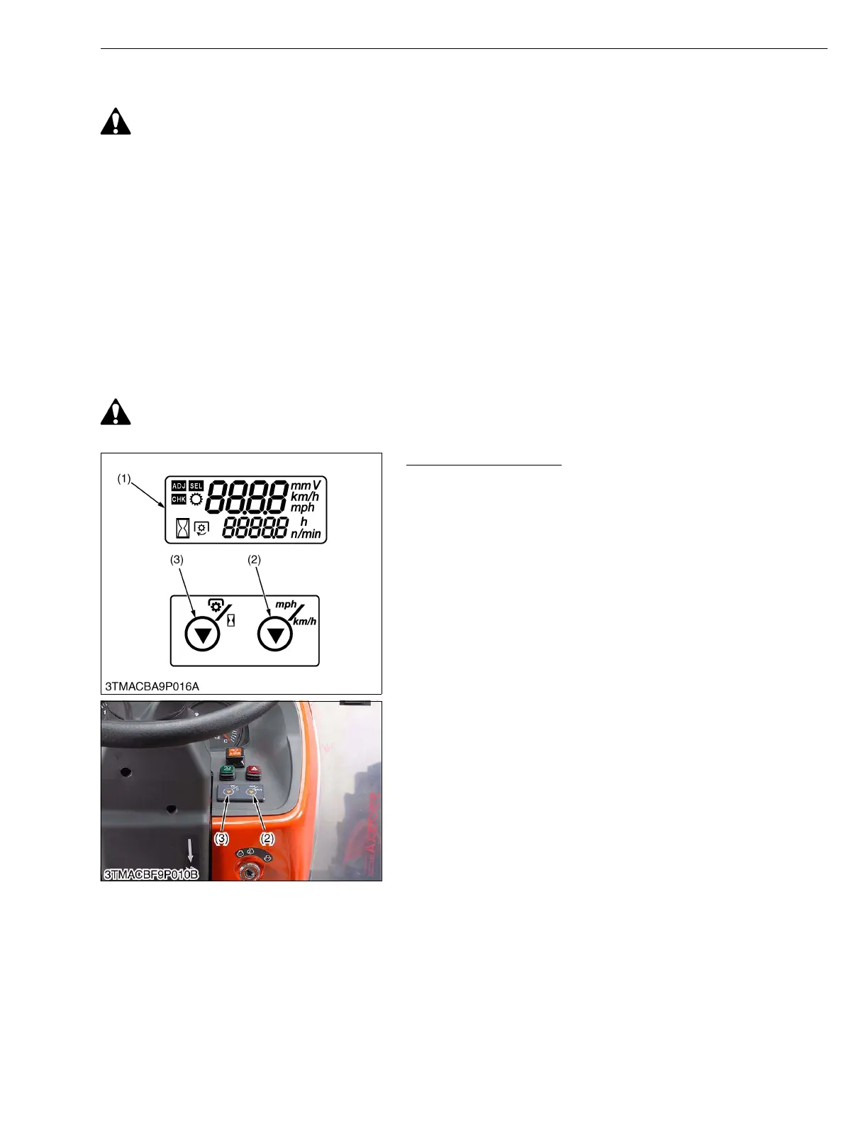 LCD monitor (1), PTO/Hour meter select switch (3) and traveling