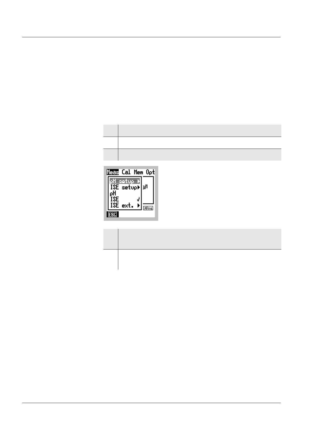 the main Meas menu. The active pH or ISE setting is marked