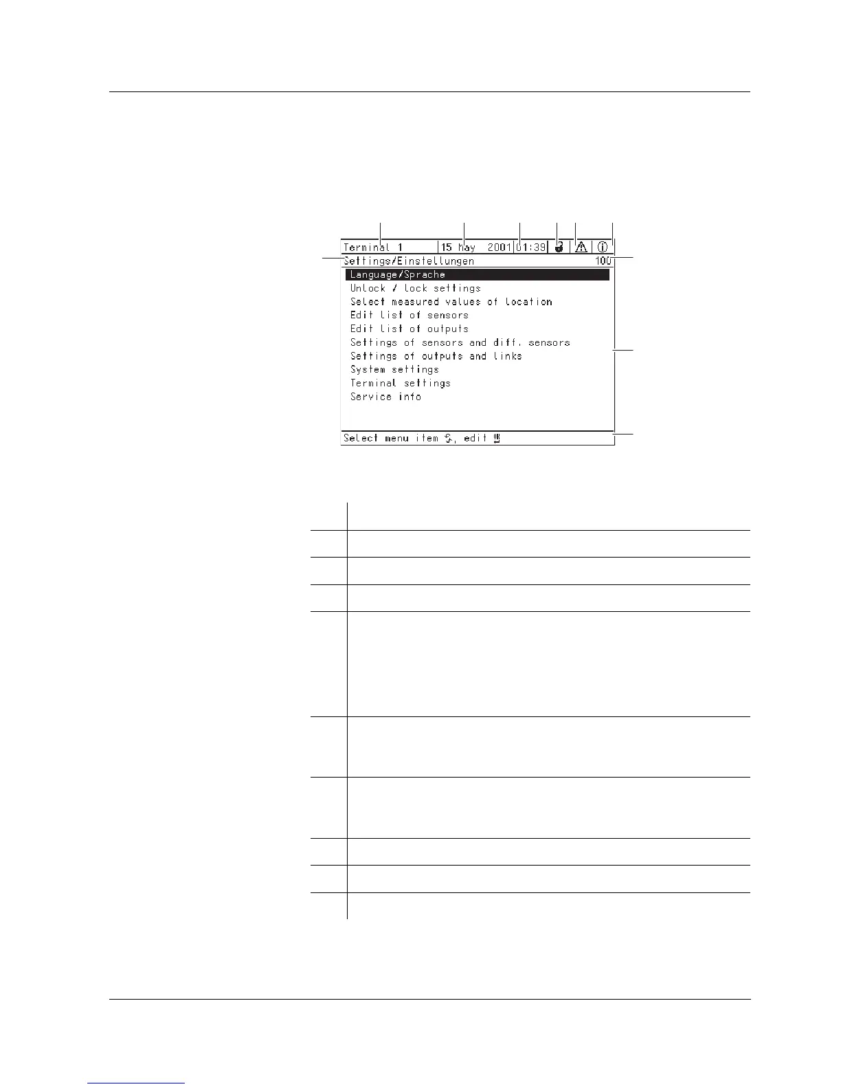 9 Display range for measured values, menus, lists, etc.