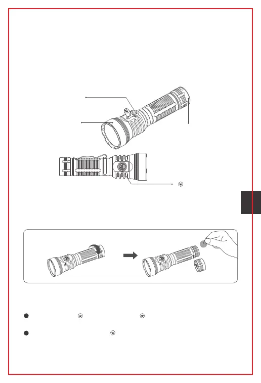 開機/關機:單擊 鍵點亮手電筒; 按住 鍵2秒關機。手電筒具有檔位記憶功