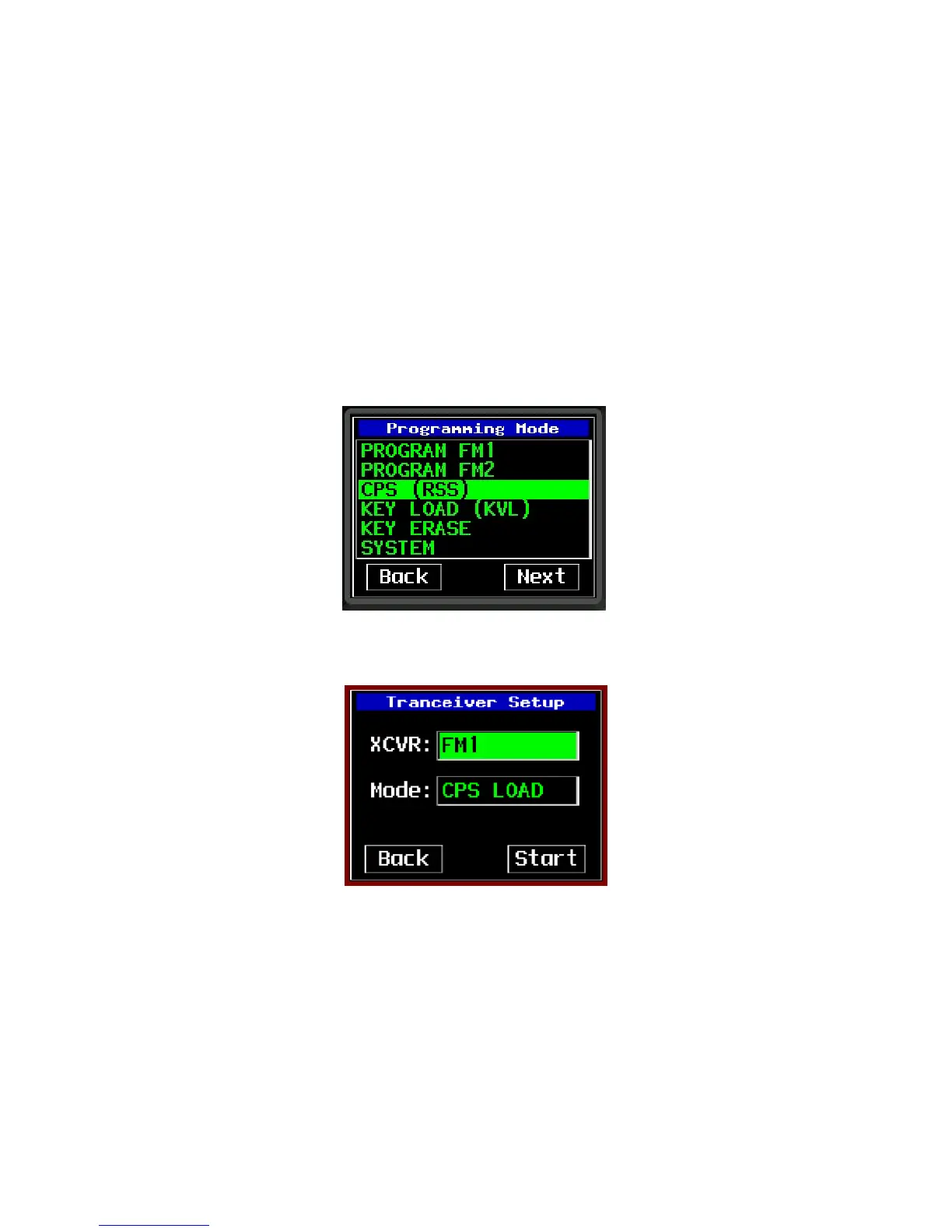 • Highlight the CPS option and press the enter button. The Transceiver Setup page will be displayed with the
