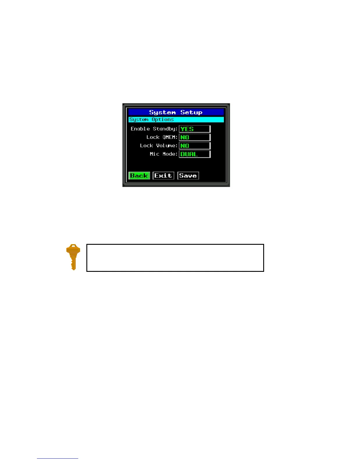 • To Save the changes made to the SYSTEM SETUP, highlight the “SAVE” option and press enter. The screen