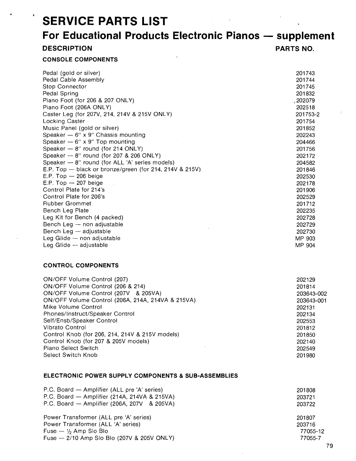 Wurlitzer 200A - Service Parts List (Console Components)