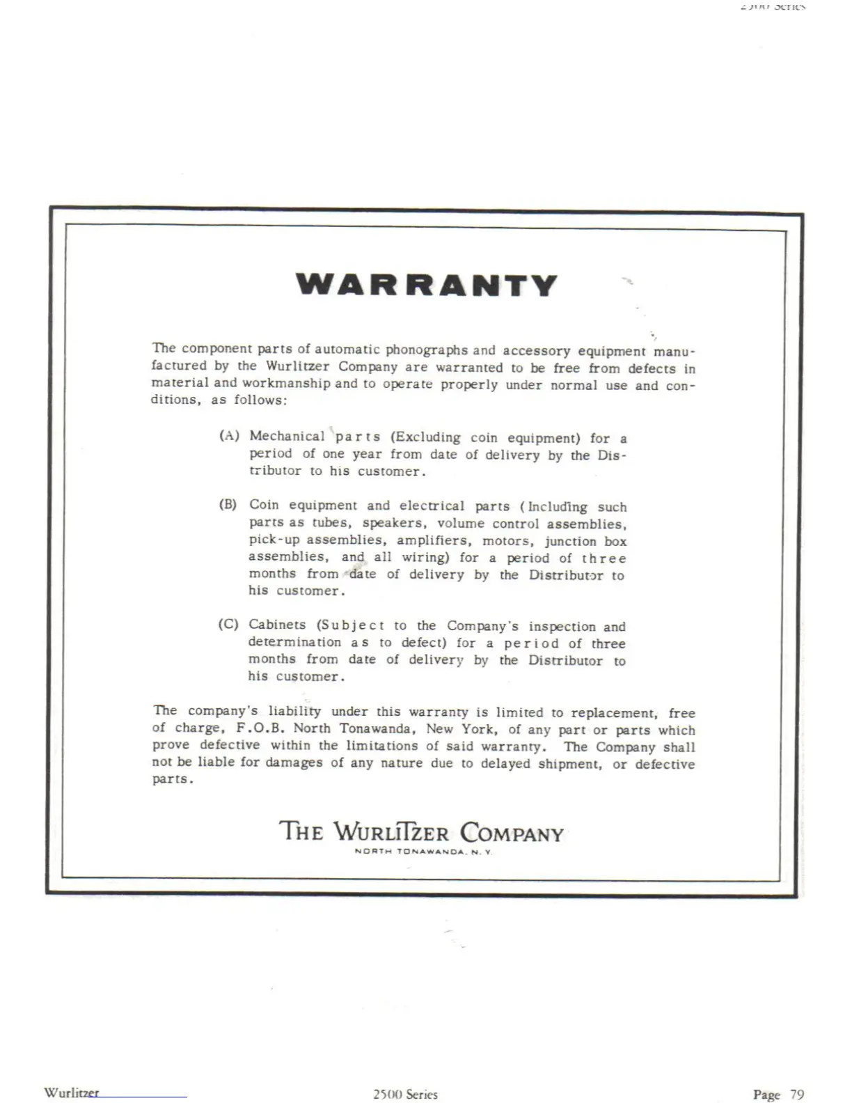 Wurlitzer 2500 - WARRANTY; WURLITZER PRODUCT WARRANTY