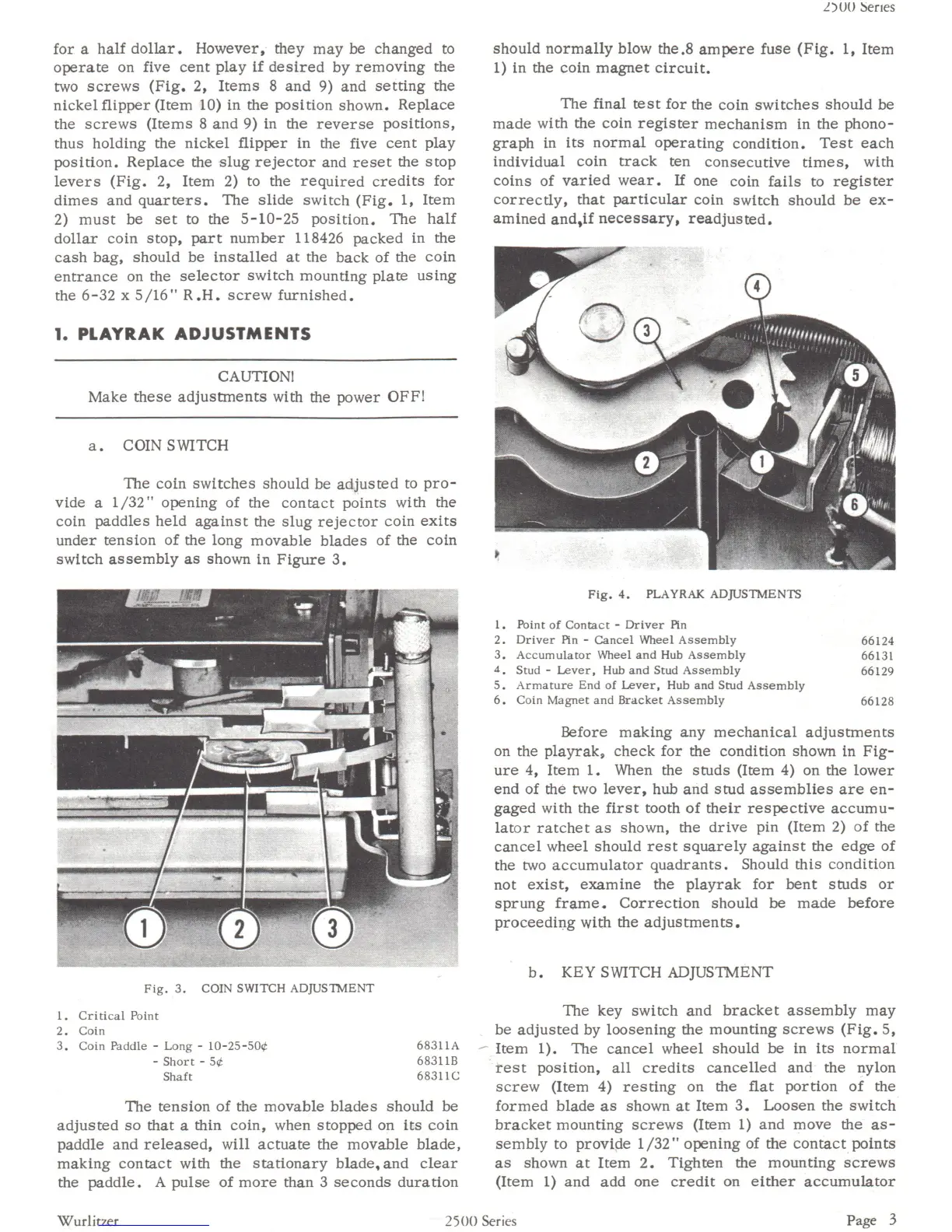 Wurlitzer 2500 - PLAYRAK ADJUSTMENTS; COIN SWITCH ADJUSTMENT; KEY SWITCH ADJUSTMENT